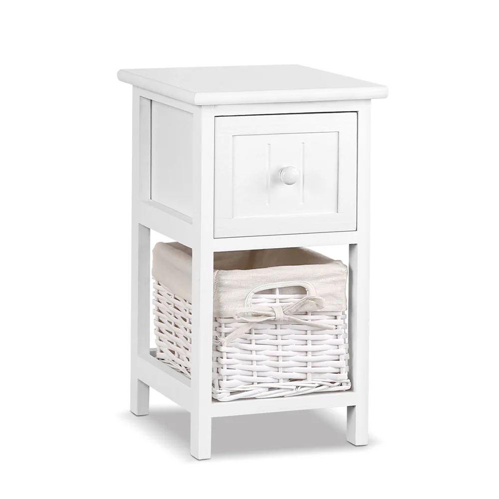 Artiss Bedside Table 1 Drawer with Basket Rustic White X2