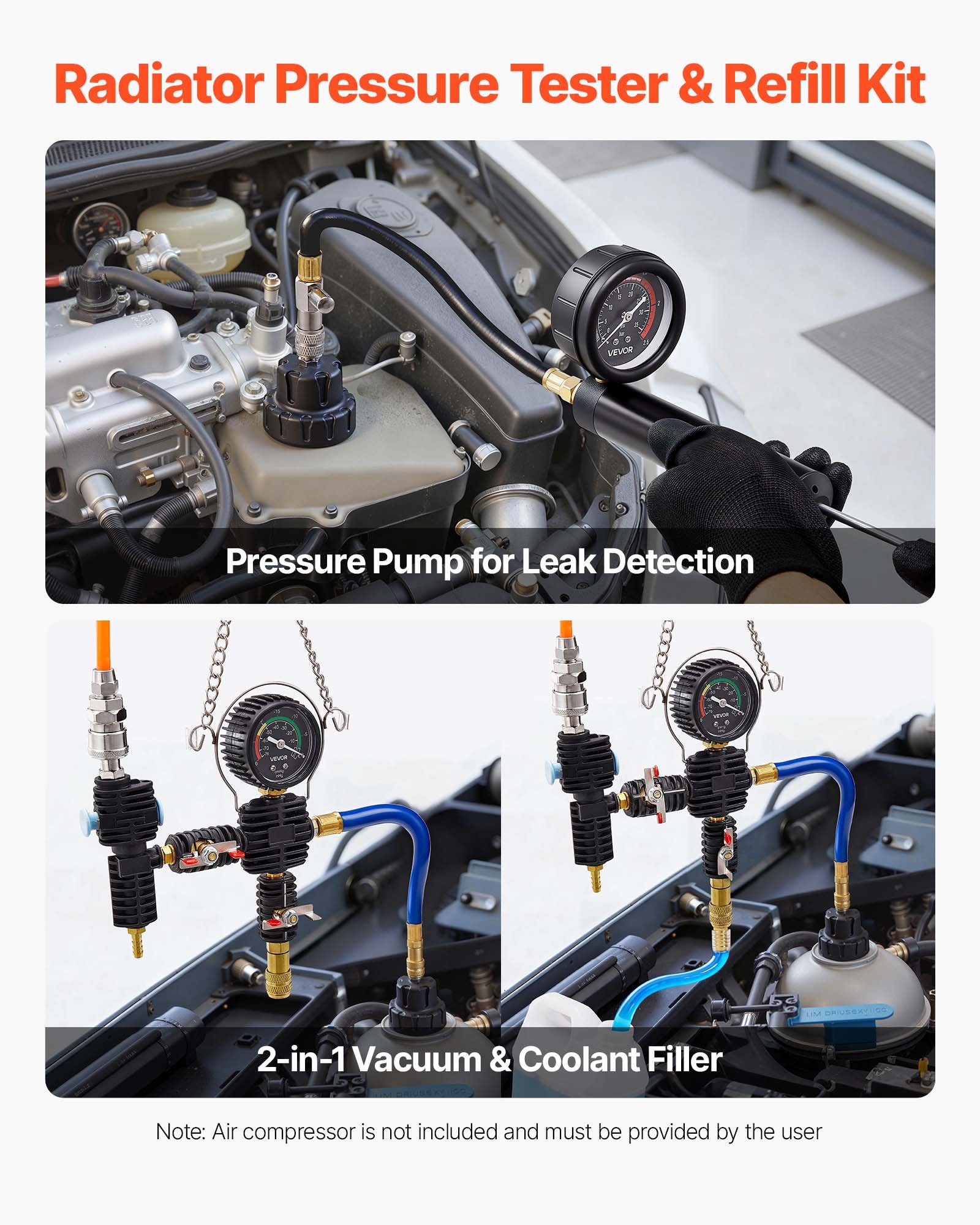 Coolant Pressure Tester Kit, 47Pcs Radiator Vacuum Refill Kit with 3 Metal Adapters, Universal Fit, Automotive Cooling System Pressure Tester Tool, with Pressures Pump & Aluminum-Plastic Filler