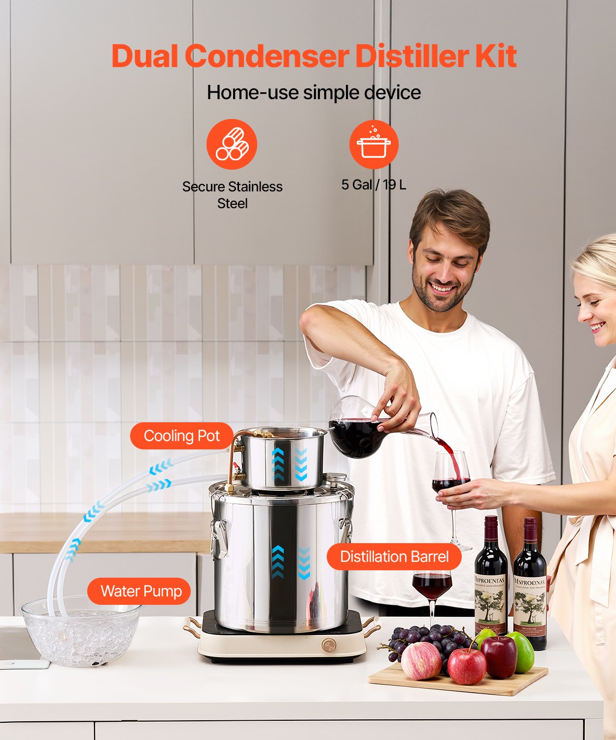 Alcohol Still, 5 Gal / 19 L Stainless Steel Water Alcohol Distiller with Copper Coil for Fast Cooling, Dual Condenser Distiller Kit with Secondary Distillation, for Wine Whisky Brandy, Silver