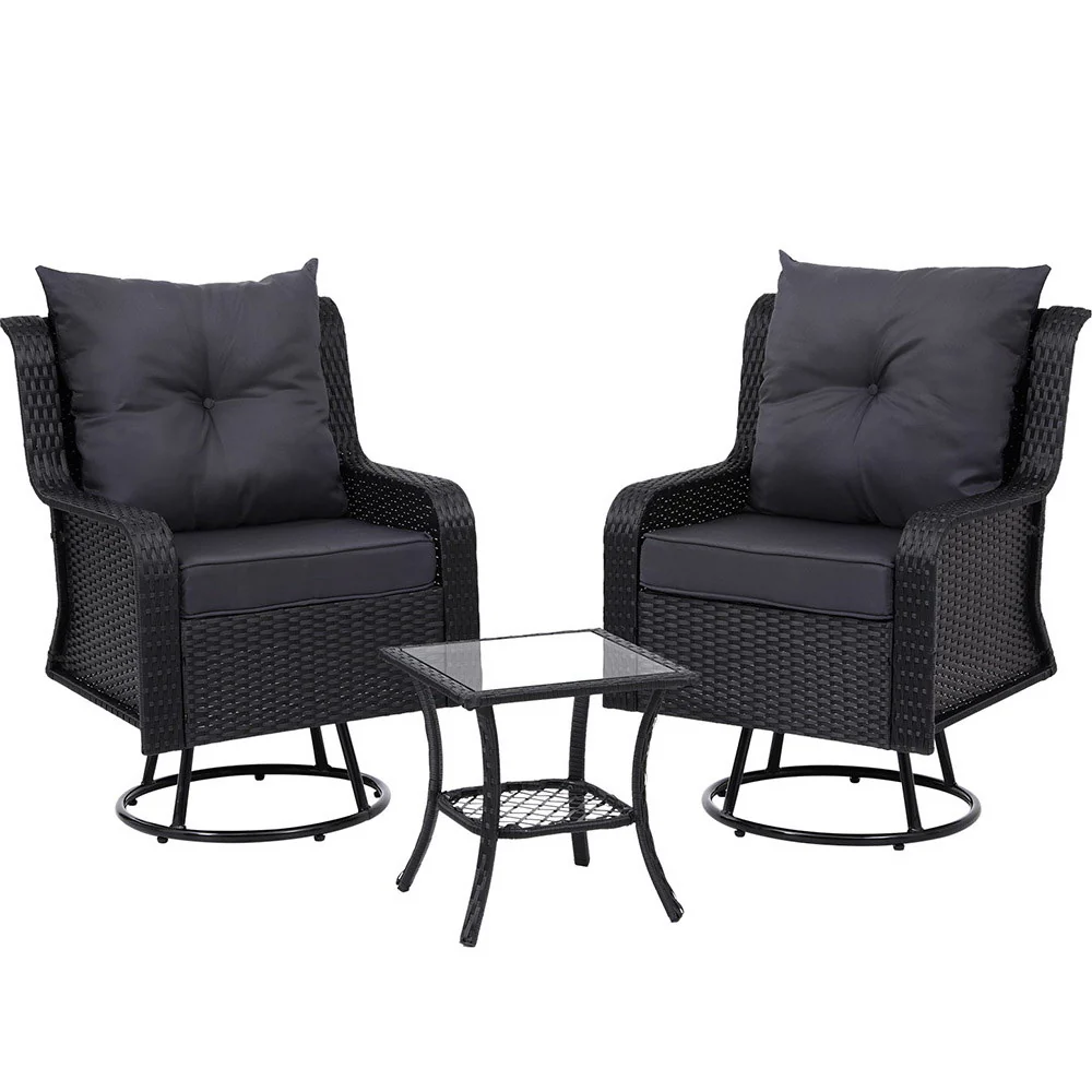 Gardeon 3PC Outdoor Furniture Bistro Set Lounge Wicker Swivel Chairs Table Cushion Black