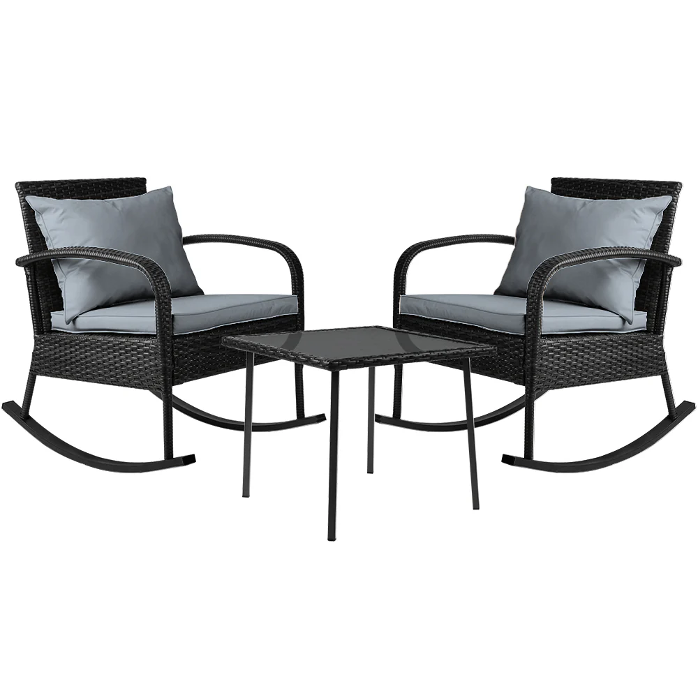 Gardeon 3PC Rocking Chair Table Wicker Outdoor Furniture Patio Bistro Set Black