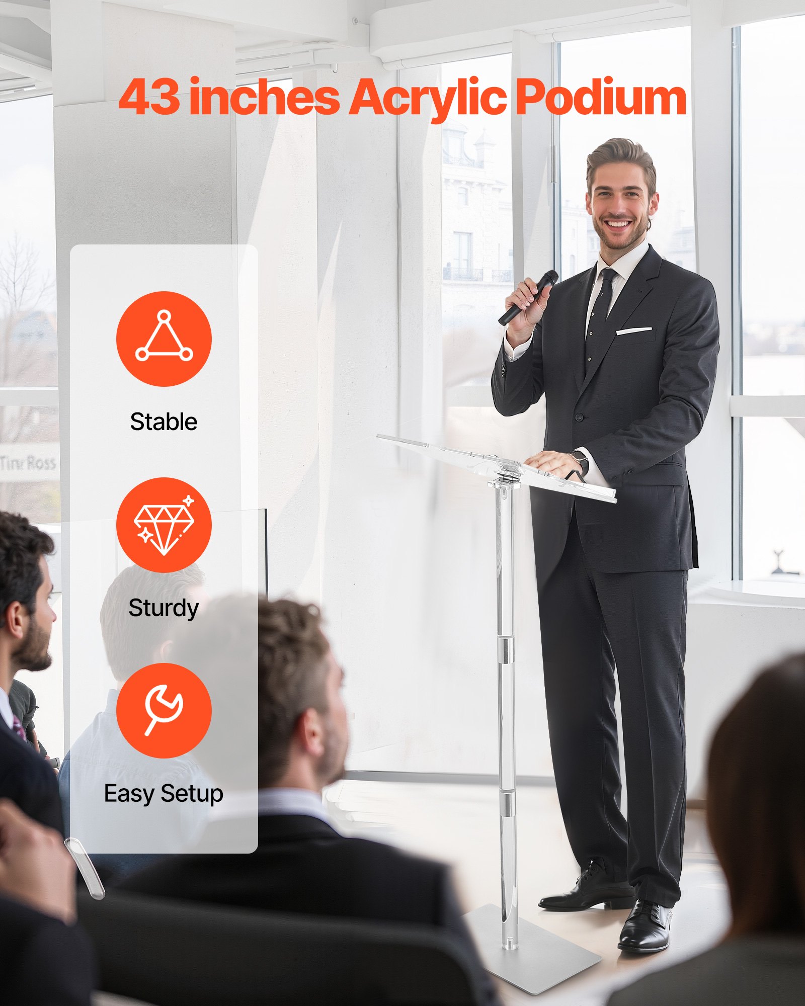 Acrylic Podium, 47" Tall, Clear Acrylic Podium Stand with Wide Reading Surface & Storage Shelf, Floor-standing Clear Pulpits Acrylic for Church Office School