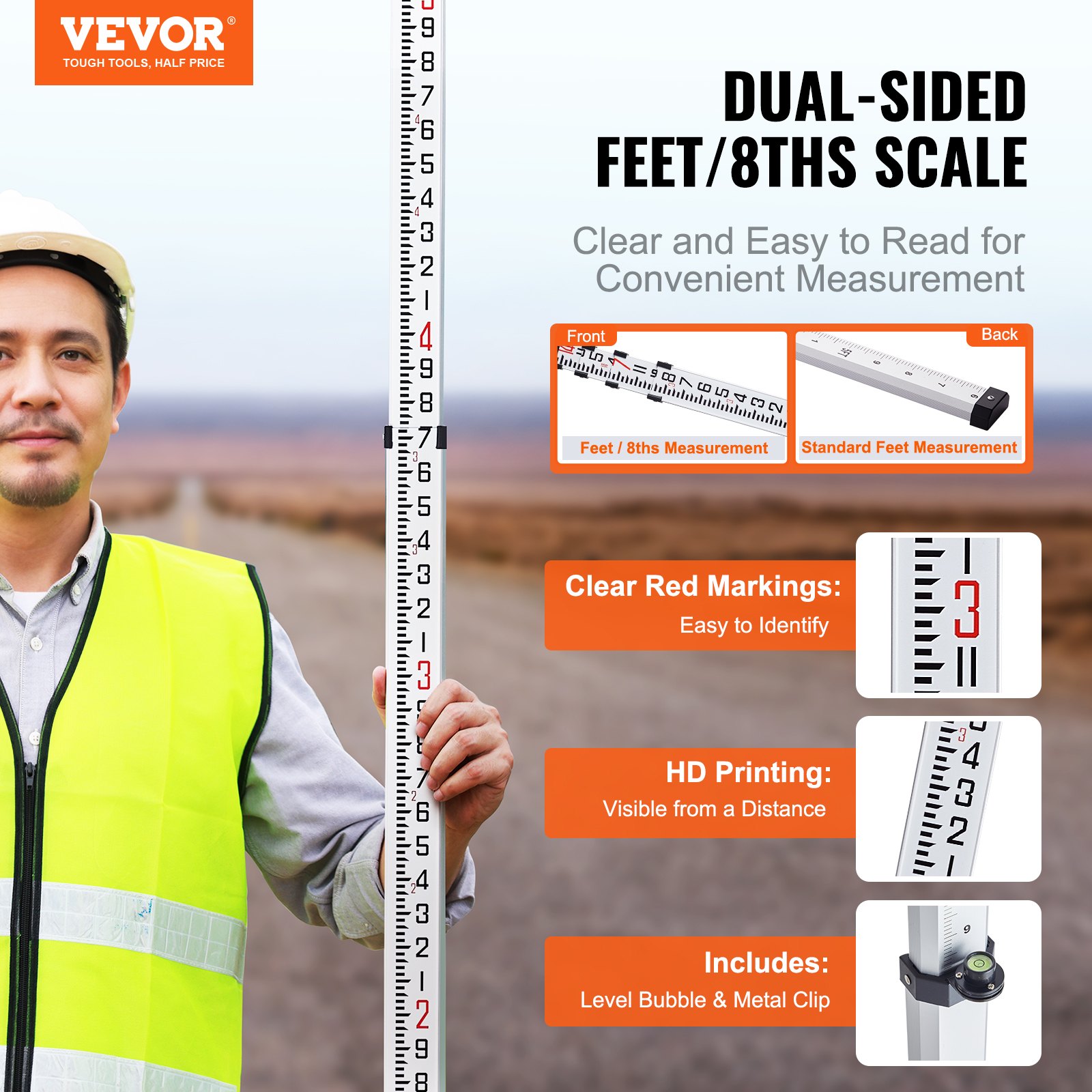 Aluminum Grade Rod, 14-Feet/8ths 4 Sections Telescopic Measuring Rod, Double-Sided Scale 1/8in Leveling Rod Stick, Aluminum Alloy Survey Rod w/ Bubble Level &Carrying Bag for Houses,Walls,Floors